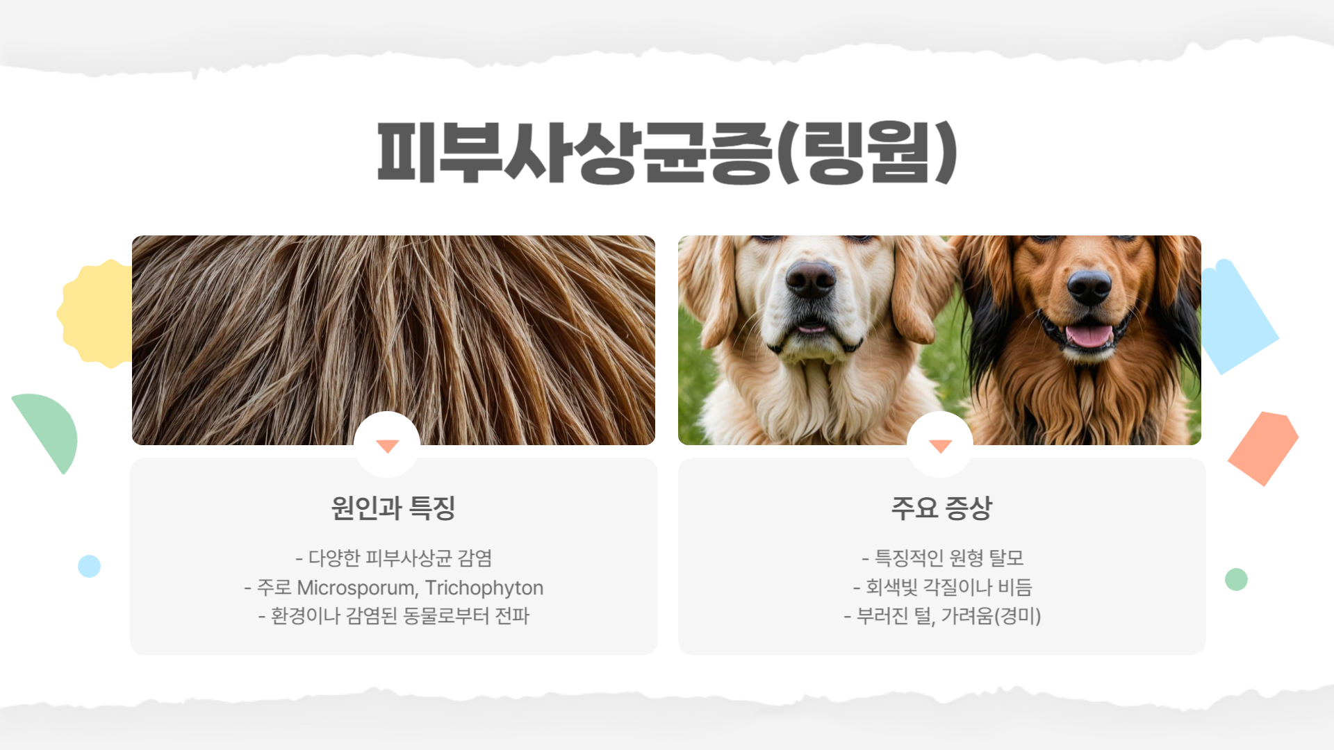 강아지 피부에 나타나는 각질, 가려움, 탈모 등의 증상은 곰팡이를 포함한 다양한 원인에 의해 발생할 수 있습니다. 특히 곰팡이성 피부염 중 링웜은 사람에게도 전염될 수 있어 더욱 주의가 필요합니다.