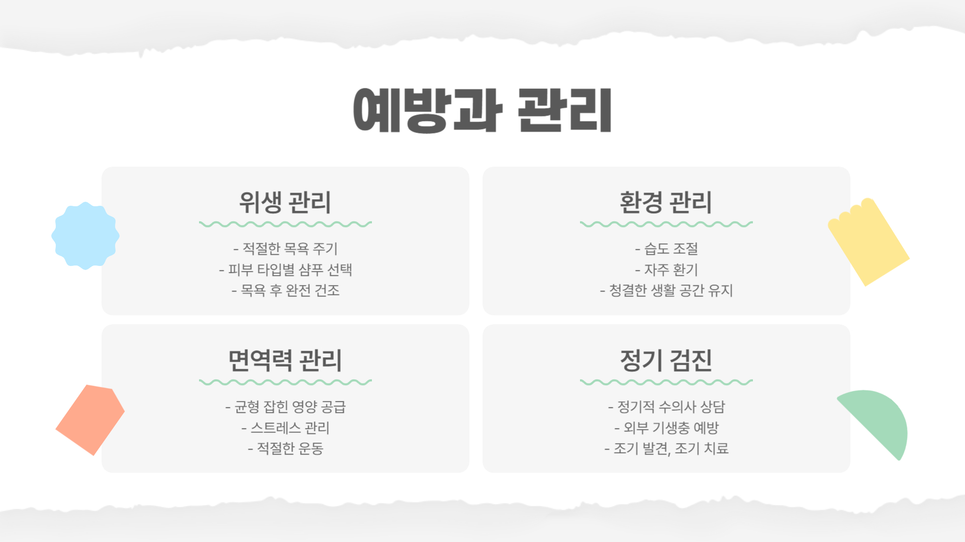 - 기저 질환 관리: 알레르기나 호르몬 질환 등 곰팡이 피부염을 유발할 수 있는 기저 질환이 있다면 꾸준히 관리합니다.