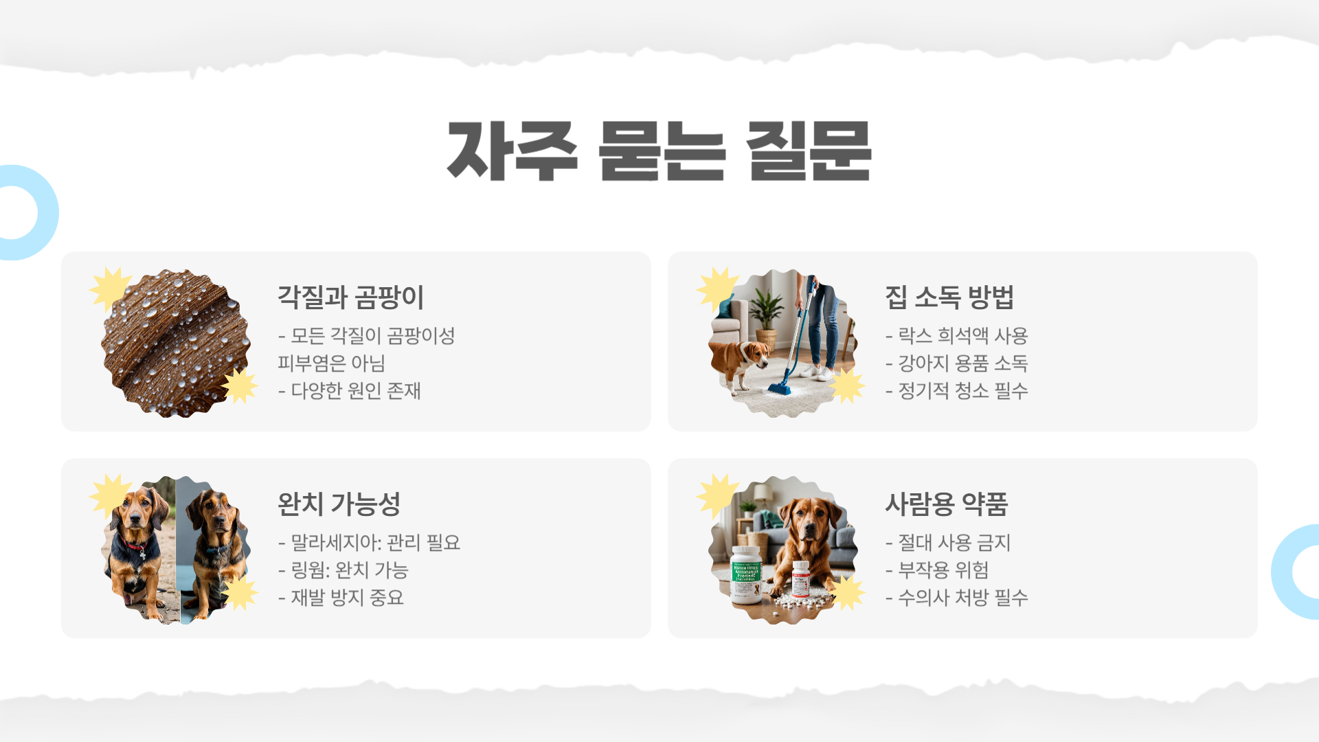 A: 곰팡이 포자는 환경에서 오래 생존할 수 있으므로 철저한 소독이 중요합니다. 락스 희석액(1:10 비율 권장, 환기 필수)이나 동물병원에서 추천하는 소독제를 사용하여 바닥, 가구, 강아지 용품 등을 자주 닦고 소독해야 합니다. 카펫이나 천 소파 등은 스팀 청소나 전문 청소 서비스를 이용하는 것이 좋습니다.