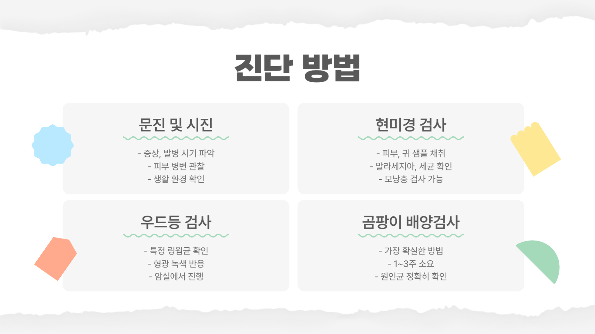 - 호발 부위: 주로 귀 안쪽(외이염의 흔한 원인), 발가락 사이, 목, 겨드랑이, 사타구니 등 따뜻하고 습하며 피부가 접히는 부위에 잘 발생합니다.