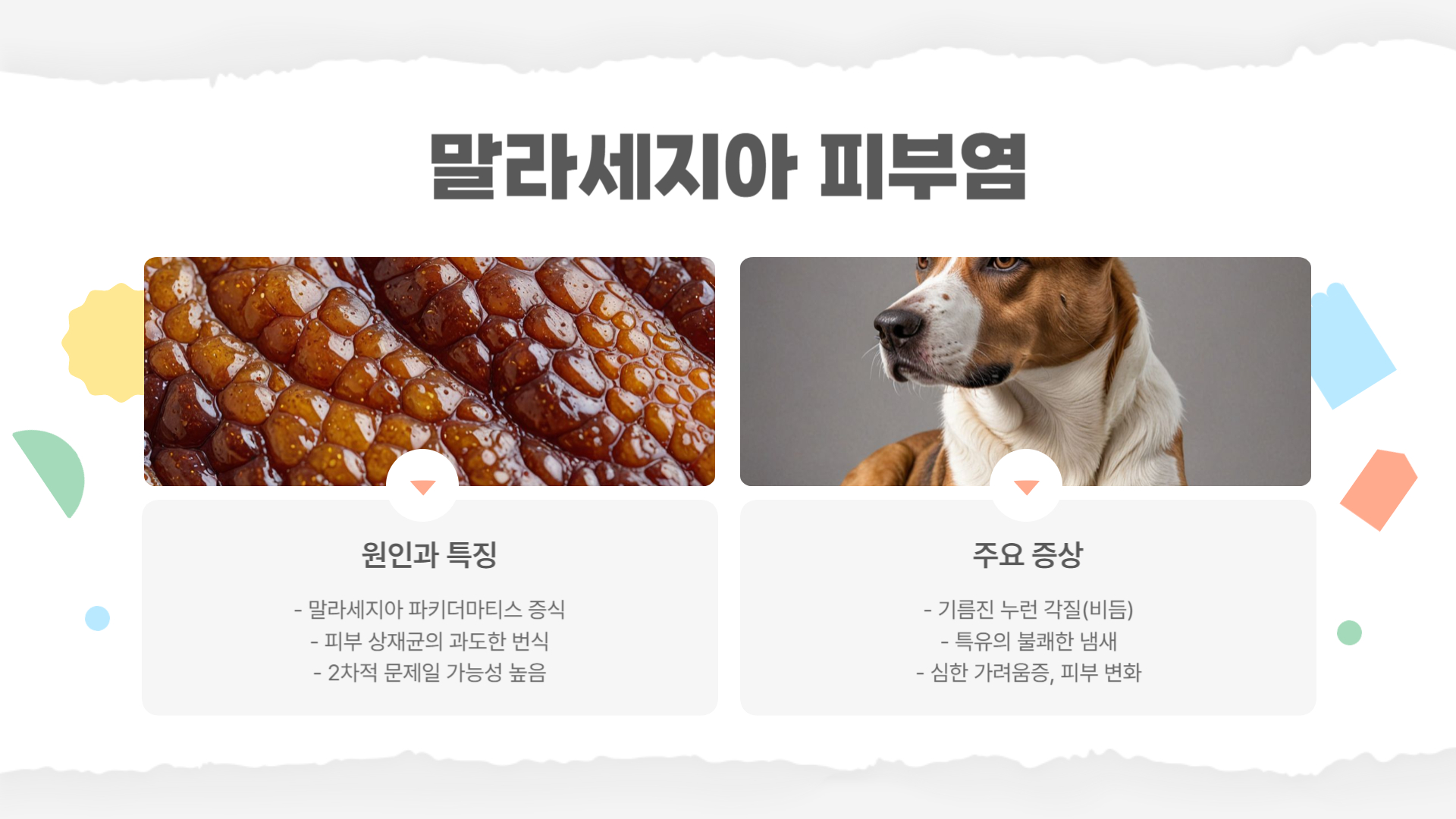 - 원인: '말라세지아 파키더마티스(Malassezia pachydermatis)'라는 효모균(Yeast)이 주원인입니다. 이 균은 원래 강아지 피부나 귀에 정상적으로 존재하는 상재균이지만, 피부 환경의 균형이 깨지면 과도하게 증식하며 문제를 일으킵니다. 균형이 깨지는 주요 요인으로는 알레르기(아토피, 식이 알레르기), 호르몬 질환, 높은 습도, 피부 주름, 면역력 저하 등이 있습니다. 즉, 말라세지아 피부염 자체는 2차적인 문제일 가능성이 높습니다.