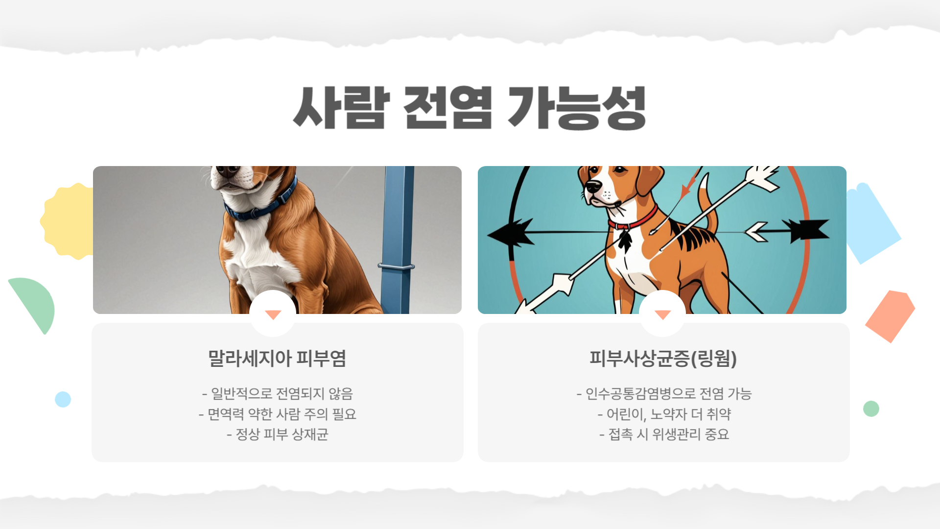 - 피부사상균증 (링웜): 네, 전염됩니다. 링웜은 인수공통감염병(Zoonosis)으로, 감염된 동물에서 사람으로, 또는 사람 간에도 전염될 수 있습니다. 특히 면역력이 약한 어린이나 노약자는 더 쉽게 감염될 수 있습니다. 강아지가 링웜 진단을 받았다면, 강아지와의 접촉 시 위생에 신경 쓰고, 강아지가 사용한 침구, 장난감 등을 소독하며, 집안 환경을 청결하게 관리하는 것이 중요합니다. 보호자에게도 유사한 피부 증상이 나타난다면 즉시 피부과 진료를 받아야 합니다.