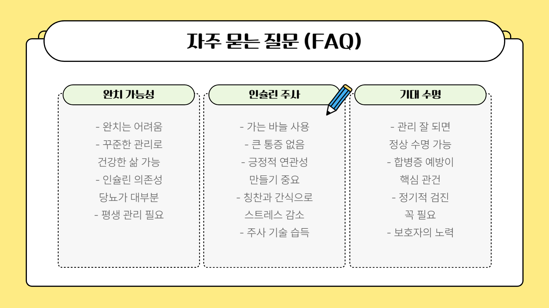 - 관리 일지 작성: 인슐린 주사 시간/용량, 식사 시간/종류/양, 운동 시간/강도, 혈당/요당/케톤 수치, 기타 특이사항(구토, 설사, 기력 변화 등)을 꾸준히 기록하면 치료 방향 설정에 큰 도움이 됩니다.