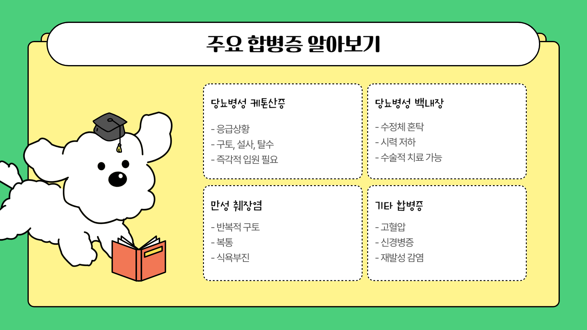 | 당뇨병성 케톤산증 (DKA) | 에너지원 부족으로 지방 분해 → 케톤체 과다 생성되어 혈액이 산성화되는 응급상황! | 구토, 설사, 심한 기력저하, 식욕부진, 탈수, 단내(아세톤) 나는 호흡, 의식 저하 등. 즉각적인 입원 치료 필요. |