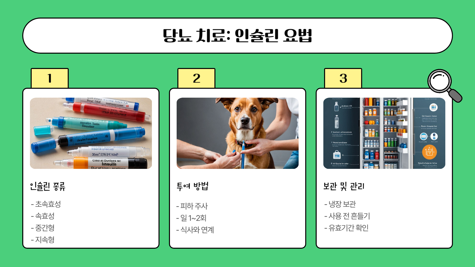 - 인슐린 주사: 보호자가 직접 인슐린을 주사해야 하므로, 정확한 용량 측정, 주사 부위(주로 등 쪽 피하), 주사 방법, 주사 시간(식사 시간과 연관) 등을 동물병원에서 충분히 교육받고 숙지해야 합니다.