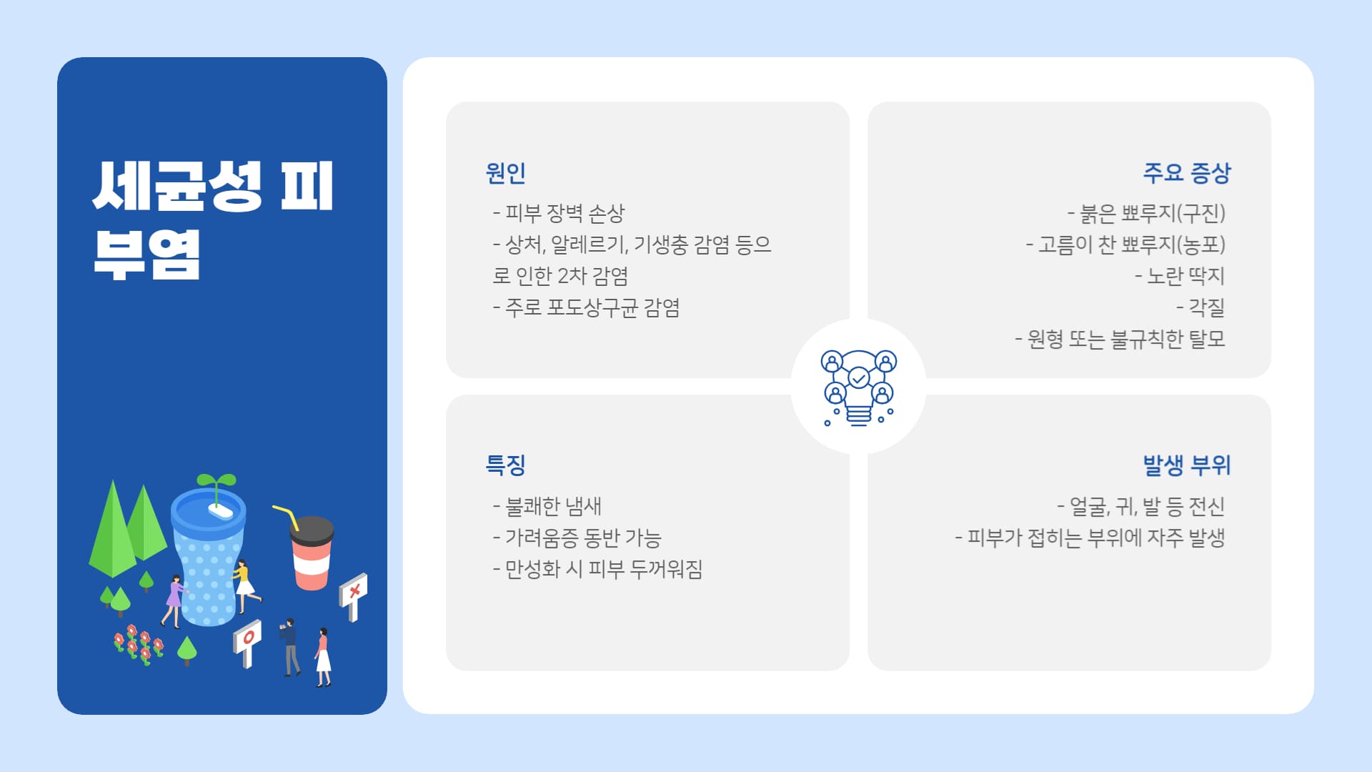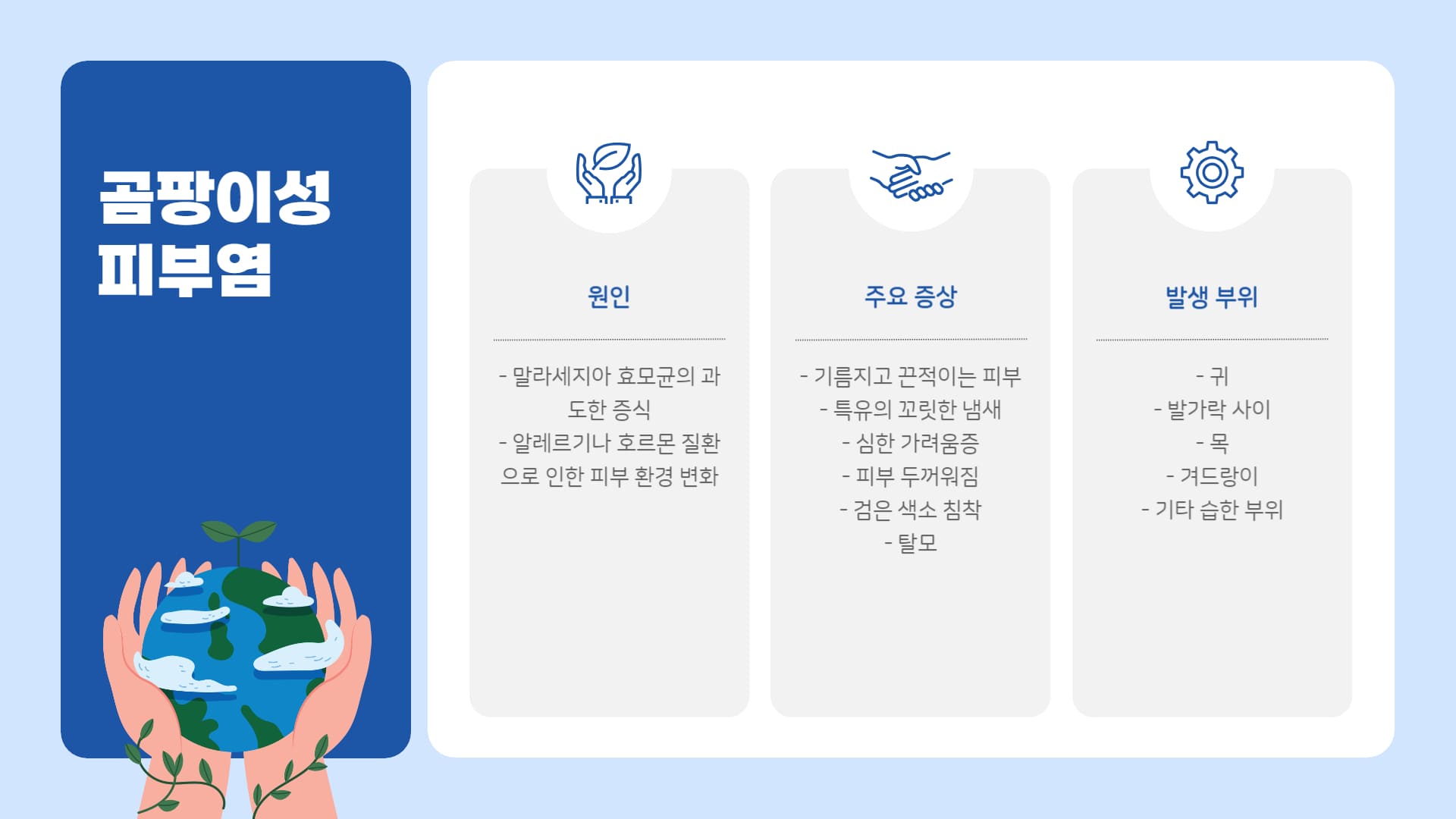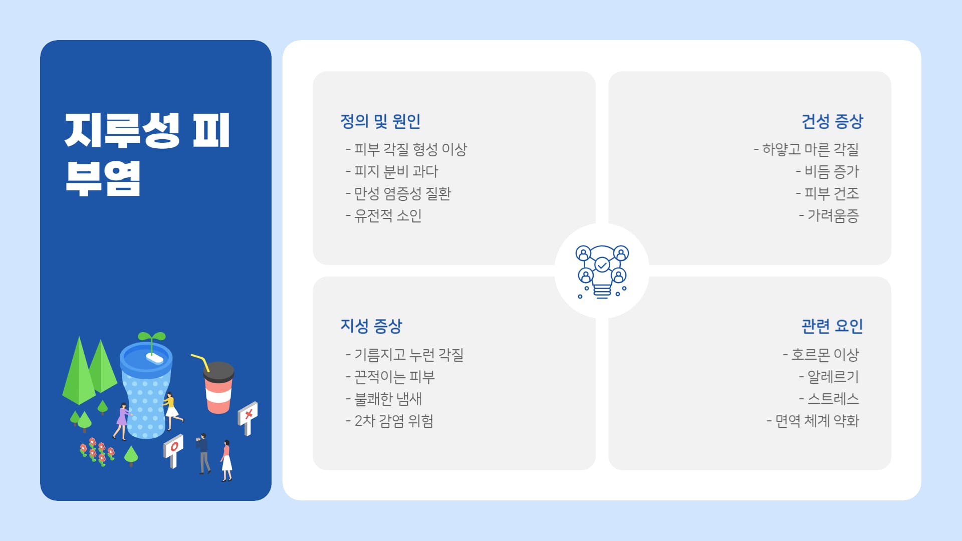 • 원인: 피부 각질 형성 과정이나 피지 분비의 이상으로 발생. 유전적 소인 또는 다른 질환(호르몬 이상, 알레르기 등)과 동반될 수 있음.
