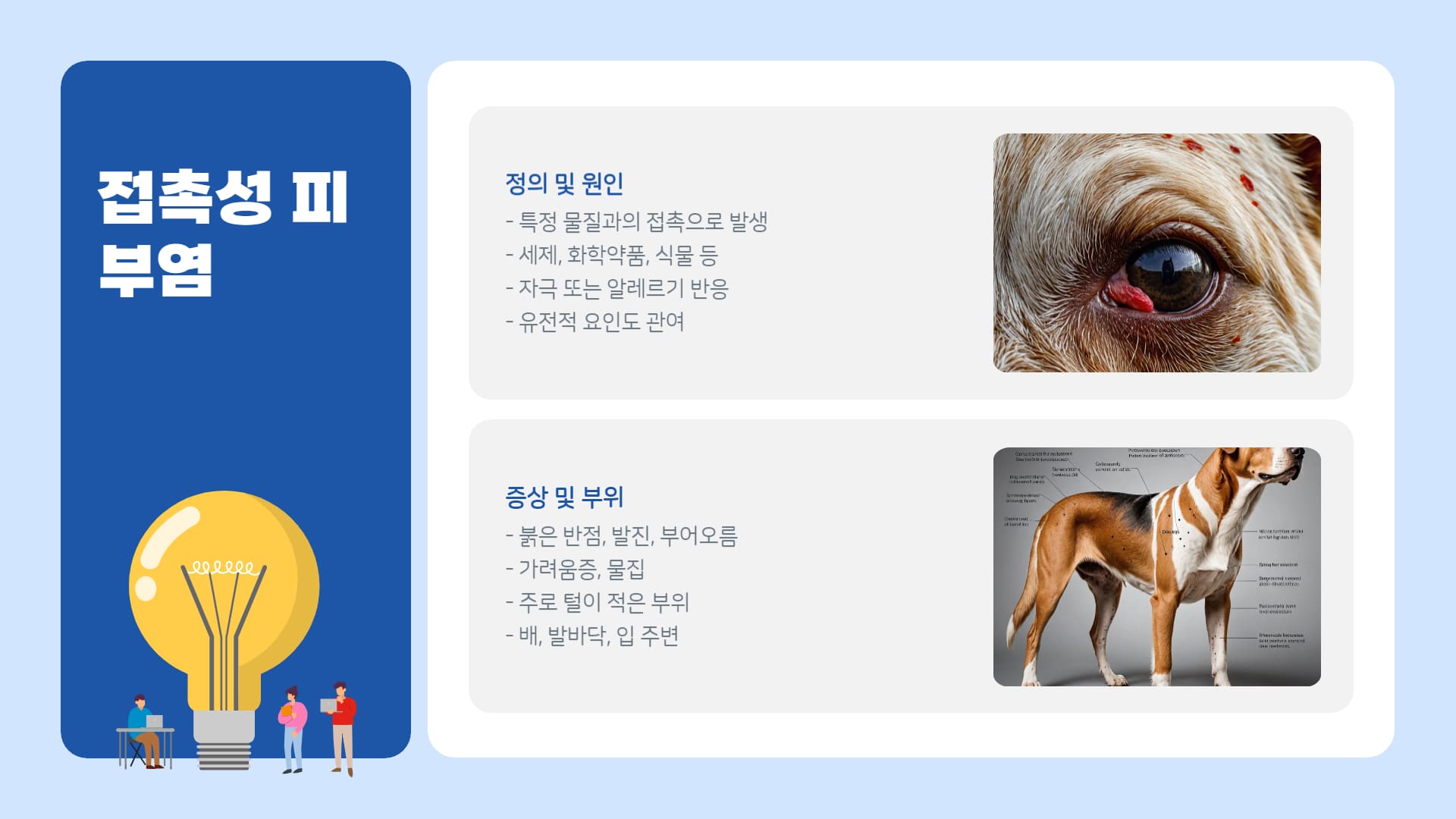 • 증상: 붉은 뾰루지(구진), 고름이 찬 뾰루지(농포), 노란 딱지, 각질, 원형 또는 불규칙한 탈모, 불쾌한 냄새, 가려움증 동반 가능.