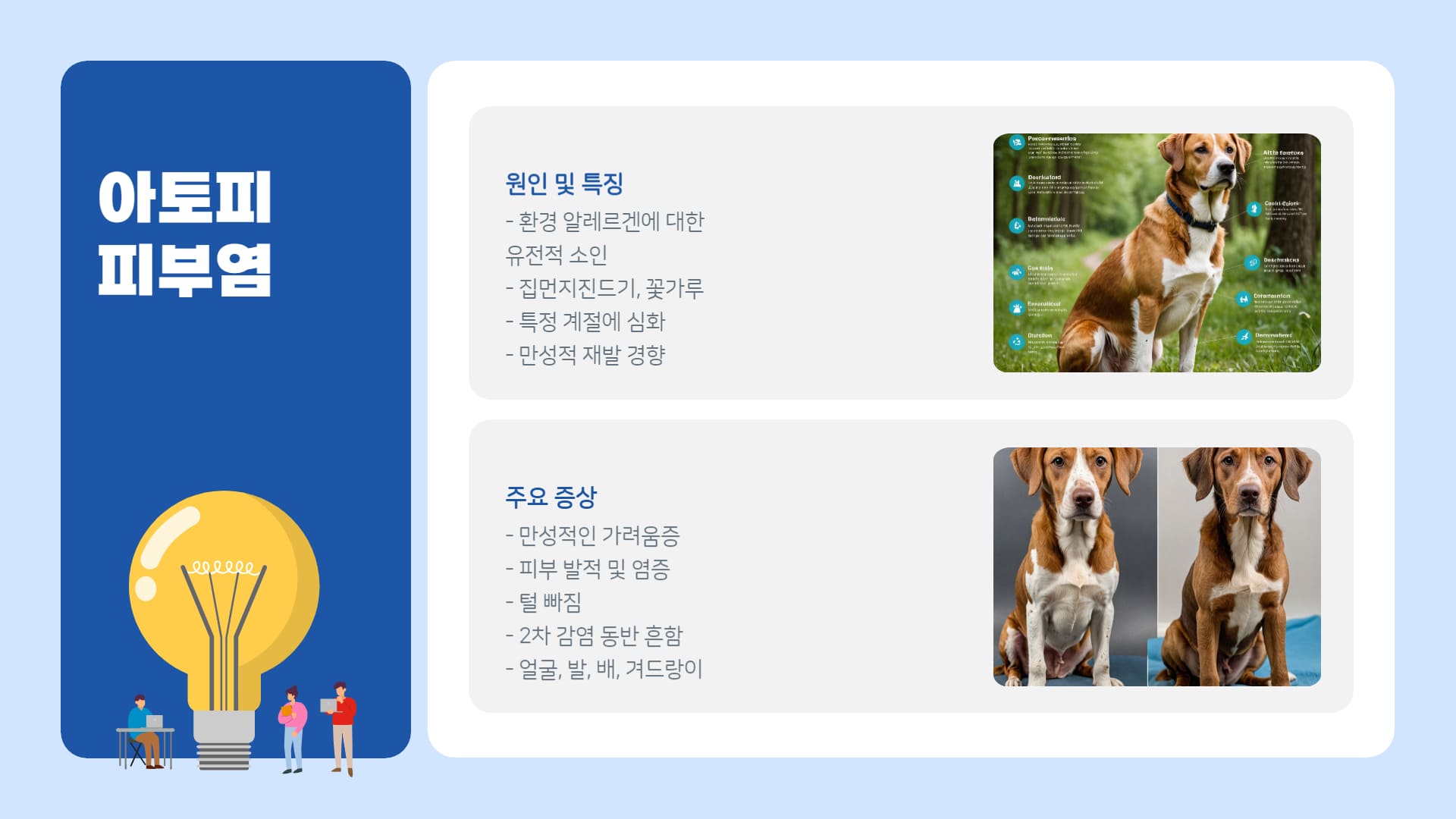 • 증상: 심한 가려움증(주로 발, 귀, 배, 사타구니, 얼굴), 피부 붉어짐, 잦은 핥기와 깨물기, 귀 염증(외이염) 재발.