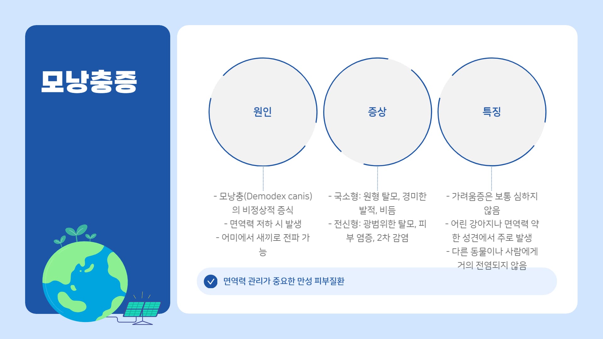 • 원인: 피부 장벽 손상(상처, 알레르기, 기생충 감염 등)으로 세균(주로 포도상구균)이 감염되어 발생 (2차 감염).