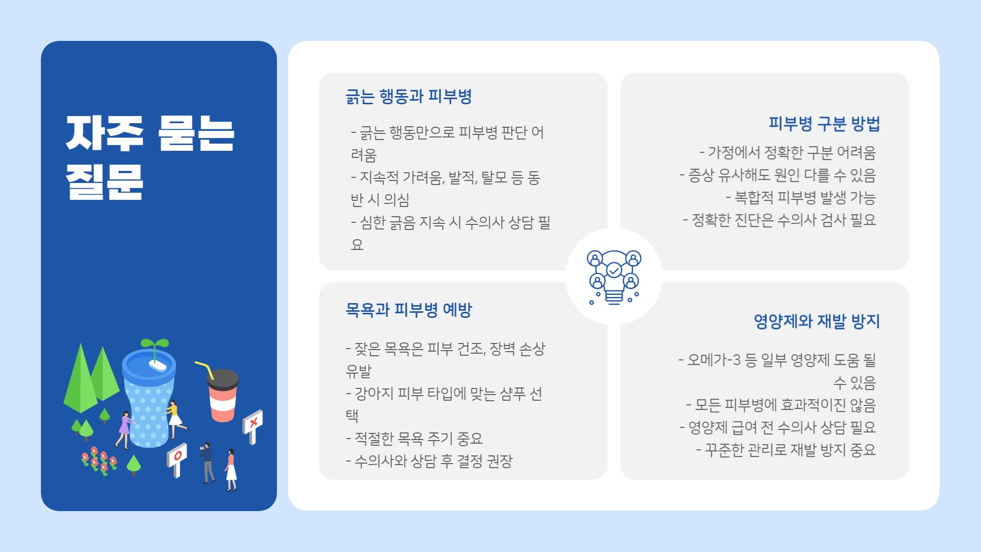 A: 너무 잦은 목욕은 오히려 피부를 건조하게 만들고 피부 장벽을 손상시켜 피부병에 취약해질 수 있습니다. 강아지의 피부 타입과 상태에 맞는 전용 샴푸를 사용하여 적절한 주기로 목욕시키는 것이 중요합니다. 수의사와 목욕 주기 및 샴푸 선택에 대해 상담해 보세요.