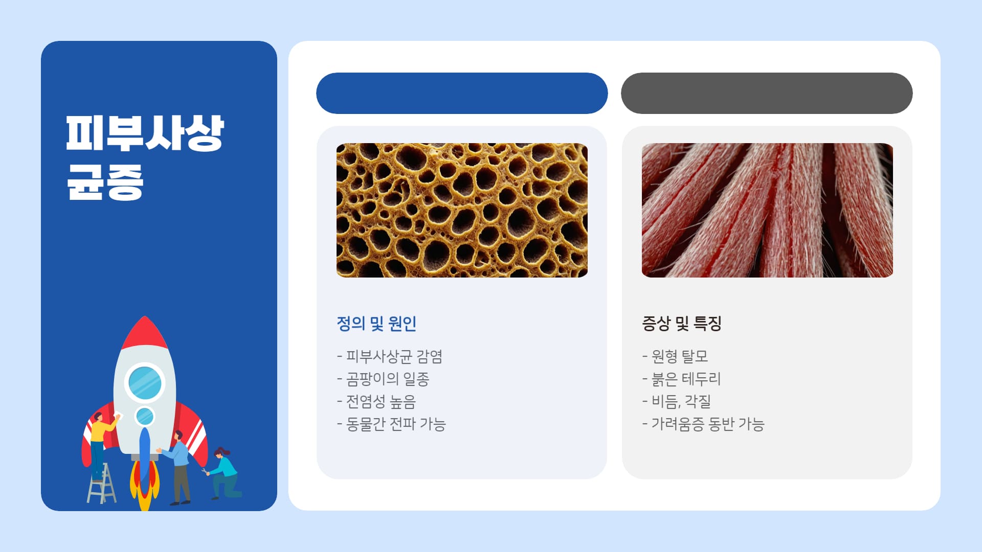 • 원인: 피부사상균이라는 곰팡이에 감염되어 발생.