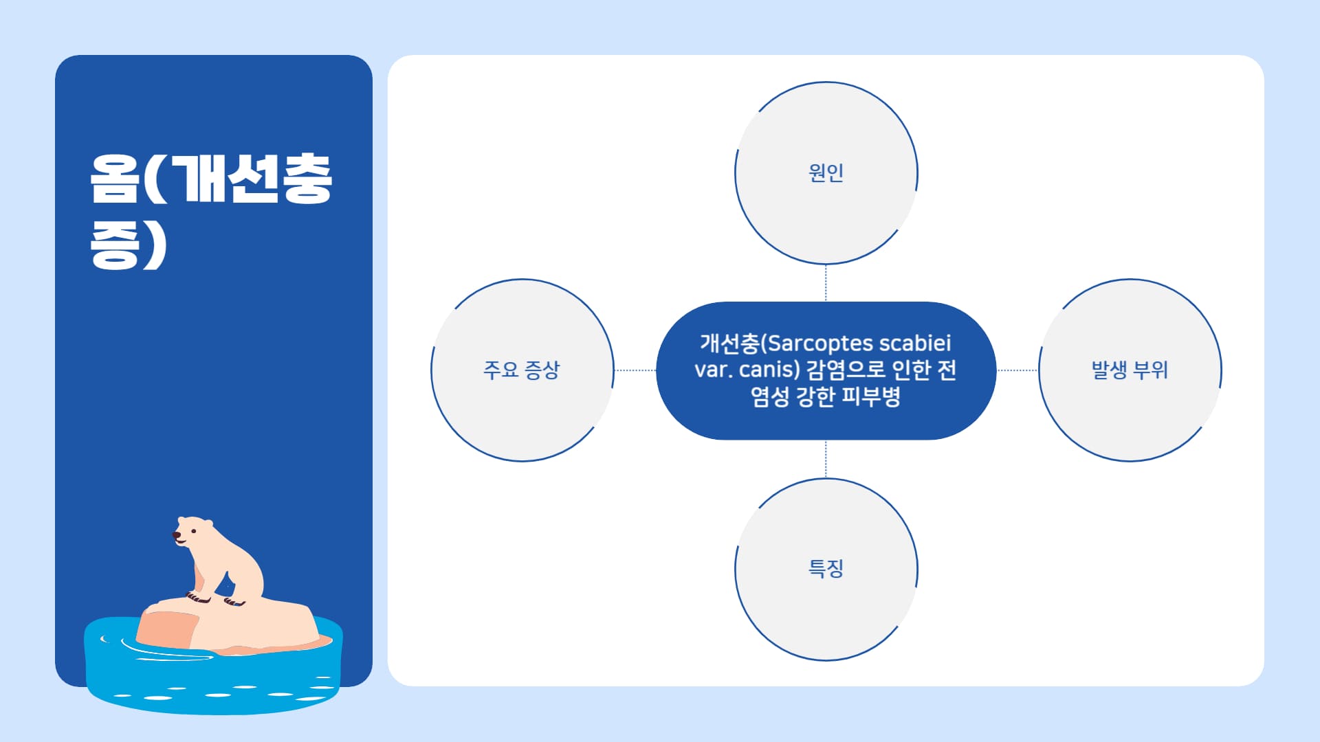 • 원인: 피부 표피층에 굴을 파고 기생하는 개선충(Sarcoptes scabiei var. canis) 감염.
