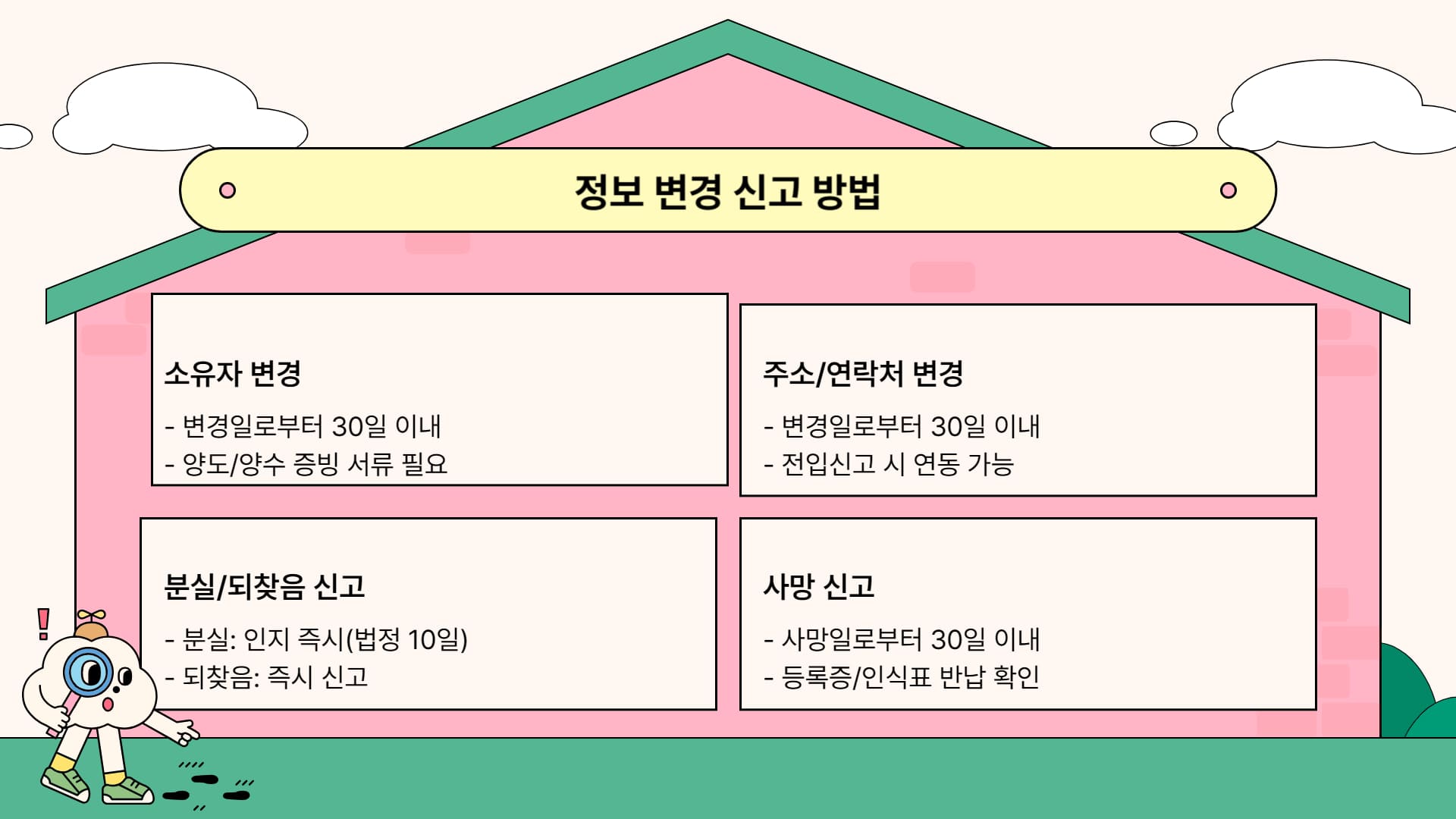 ※ 중요: 변경 신고를 제때 하지 않으면 과태료가 부과될 수 있으며, 특히 연락처나 주소 정보가 부정확하면 유실 시 동물을 되찾기 어려워집니다.