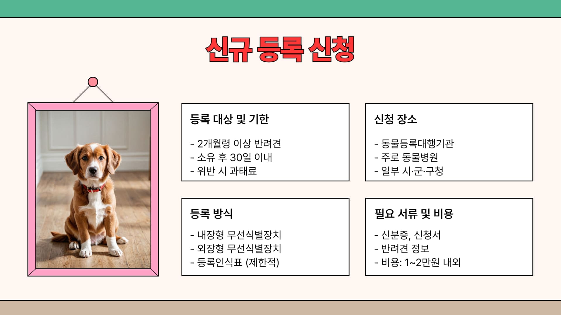 반려견을 새로 입양했거나 아직 등록하지 않았다면, 2개월령이 된 날부터 30일 이내에 등록을 신청해야 합니다.