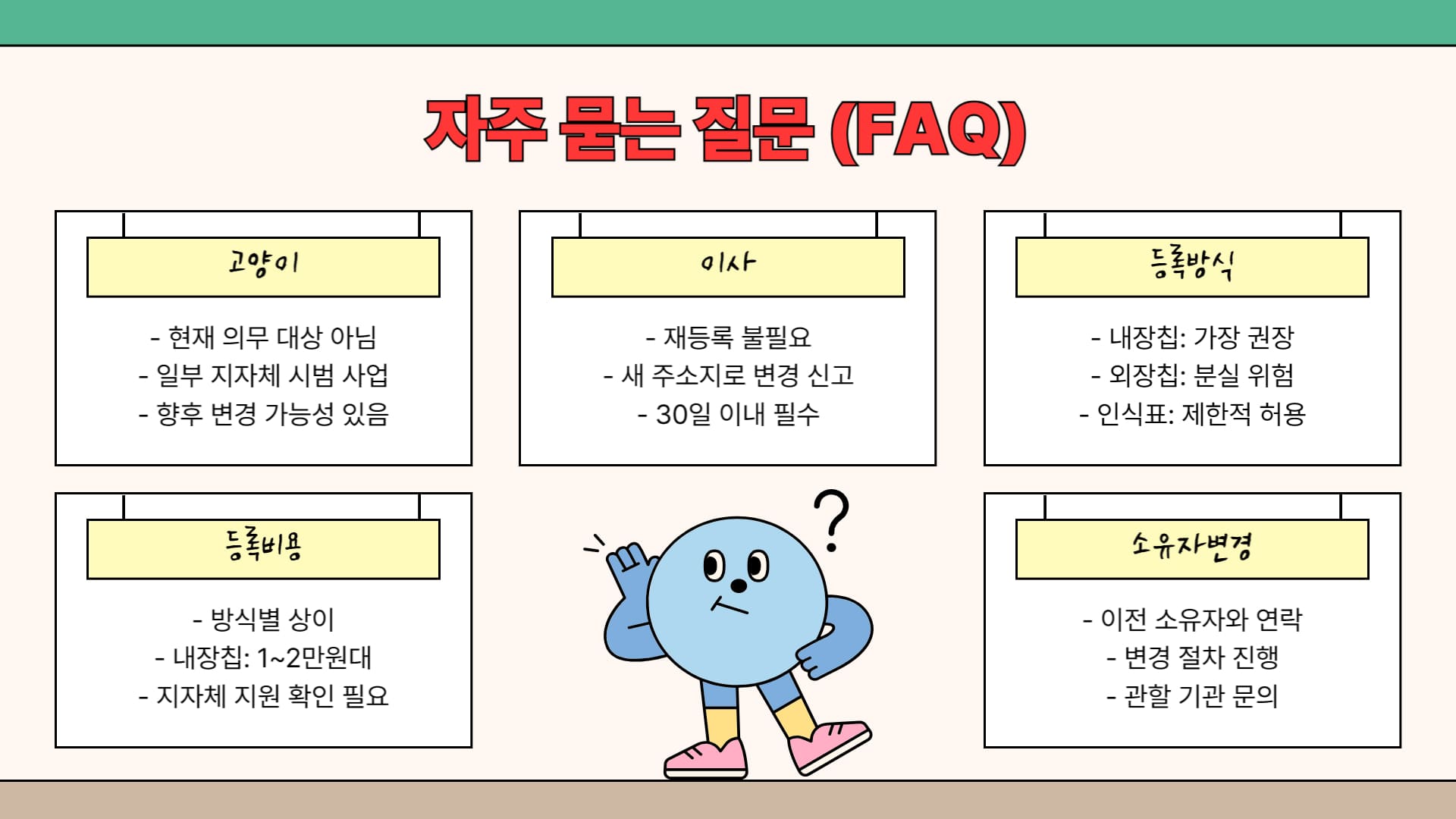 - 온라인 신고: 국가동물보호정보시스템(www.animal.go.kr)에서 본인 인증 후 간편하게 변경 신청이 가능합니다. (가장 권장되는 방법)
