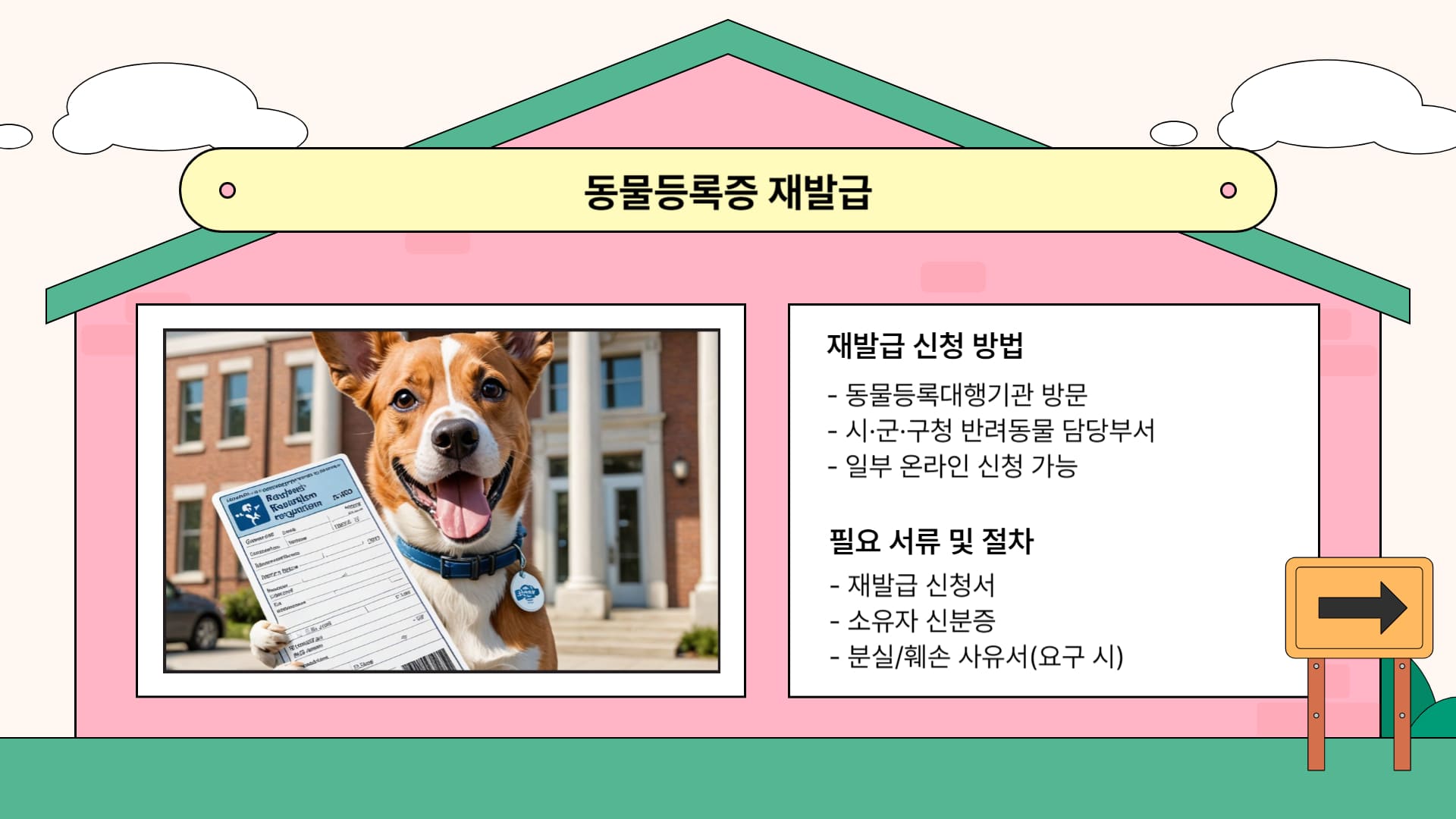 - 외장형 칩 또는 인식표 분실/훼손 시: 단순히 등록증 카드만 재발급받는 것이 아니라, 새로운 식별장치(외장칩 또는 인식표)를 구매하여 부착하고 해당 정보를 시스템에 변경 등록해야 합니다. 이 경우 등록대행기관(동물병원 등) 방문이 필요할 수 있습니다.