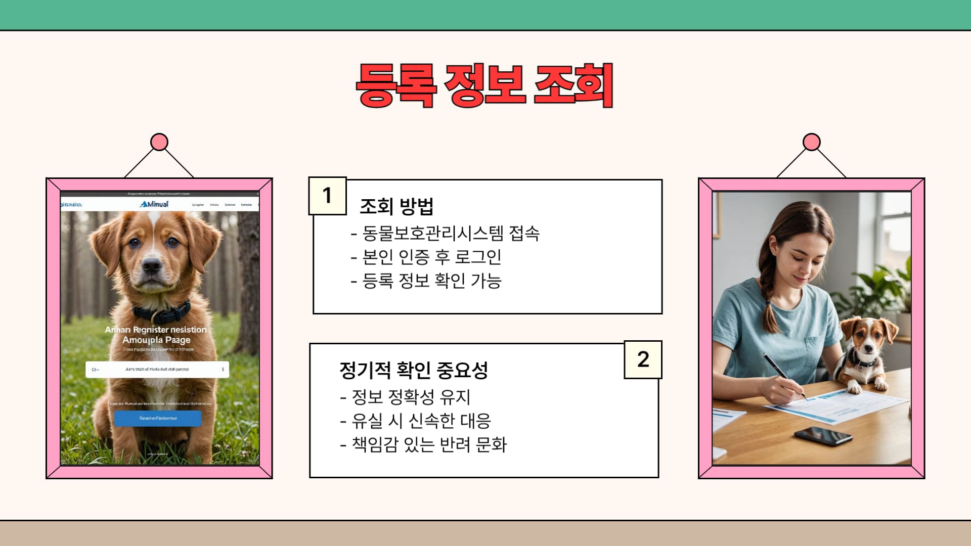 동물등록을 완료했다면, 내 정보가 제대로 등록되었는지, 변경 사항이 잘 반영되었는지 주기적으로 확인하는 것이 좋습니다.