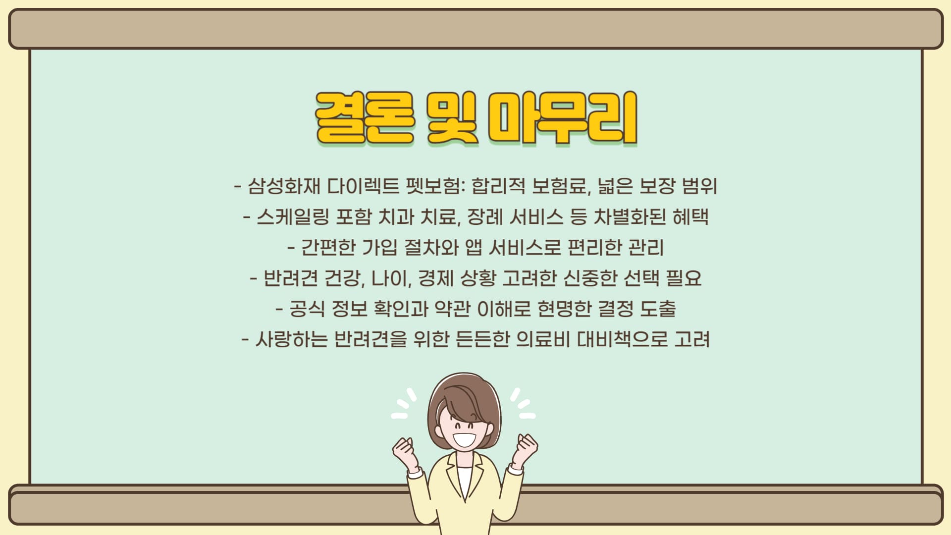 삼성화재 다이렉트 펫보험은 간편한 가입 절차와 합리적인 보험료, 그리고 스케일링까지 포함하는 비교적 넓은 보장 범위로 매력적인 선택지가 될 수 있습니다.