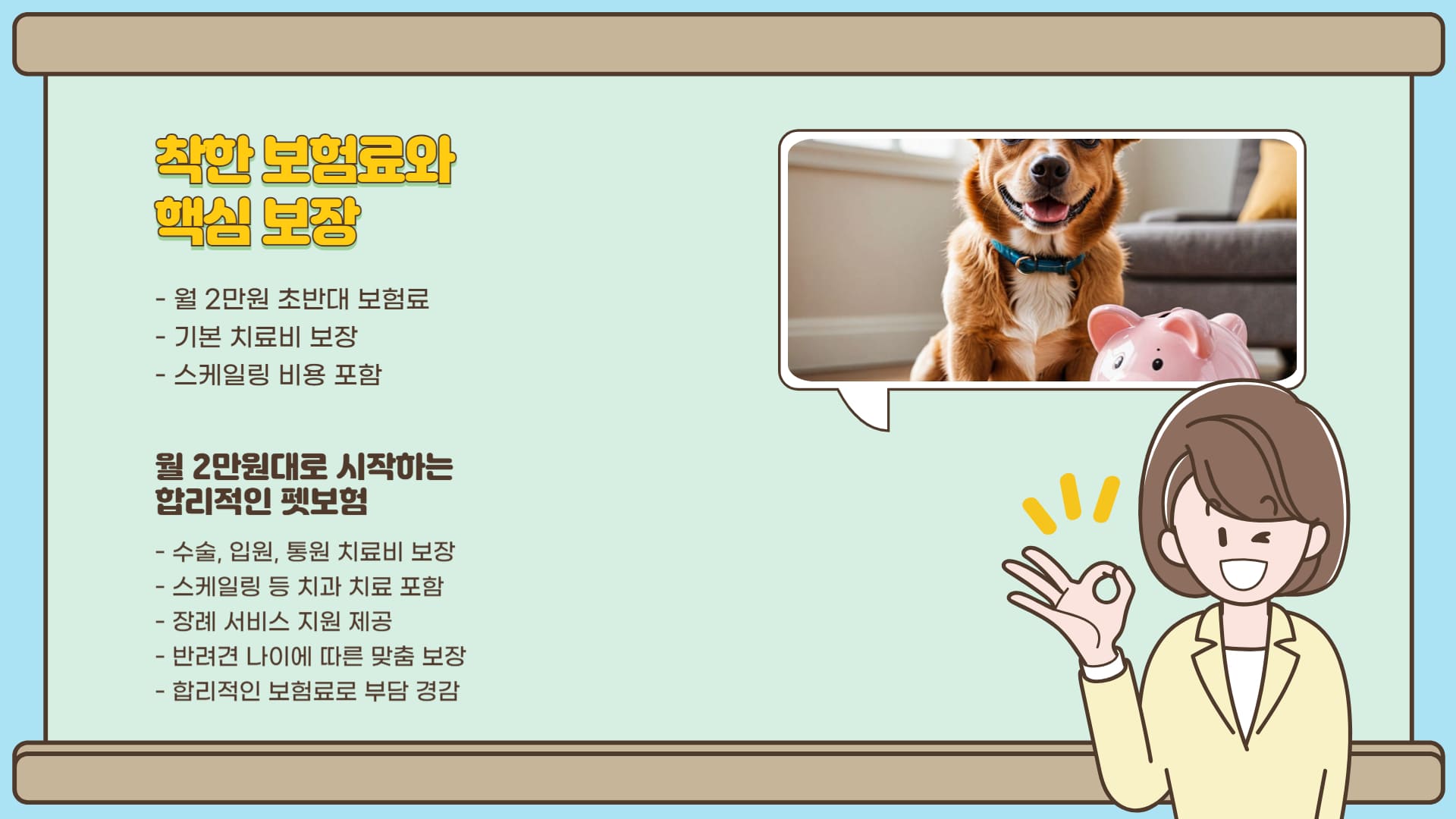 합리적인 비용으로 반려견의 기본적인 치료비는 물론, 동물병원 방문 시 은근히 부담되는 스케일링 비용까지 폭넓게 보장받을 수 있다는 점이 매력적입니다.