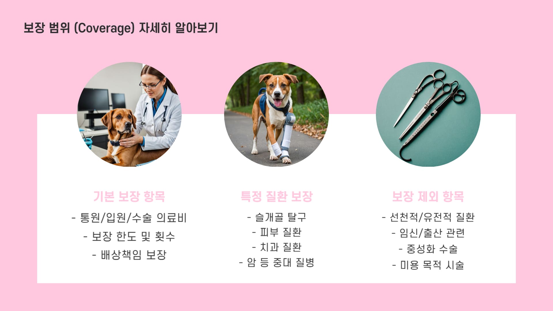 | 보장 범위 (Coverage) | 통원/입원/수술 의료비 기본 보장 여부, 보장 한도(1일/사고당/연간), 보장 횟수. 슬개골 탈구, 피부 질환, 치과 질환 등 특정 질환 보장 여부. 배상책임, 사망 위로금 등 특약 구성. | 필수 확인: 보장 제외 항목(선천적/유전적 질환, 임신/출산 관련, 중성화 수술, 미용 목적 등), 면책 기간(가입 후 일정 기간 보장 제외). 우리 아이에게 필요한 보장이 포함되어 있는지 확인. |