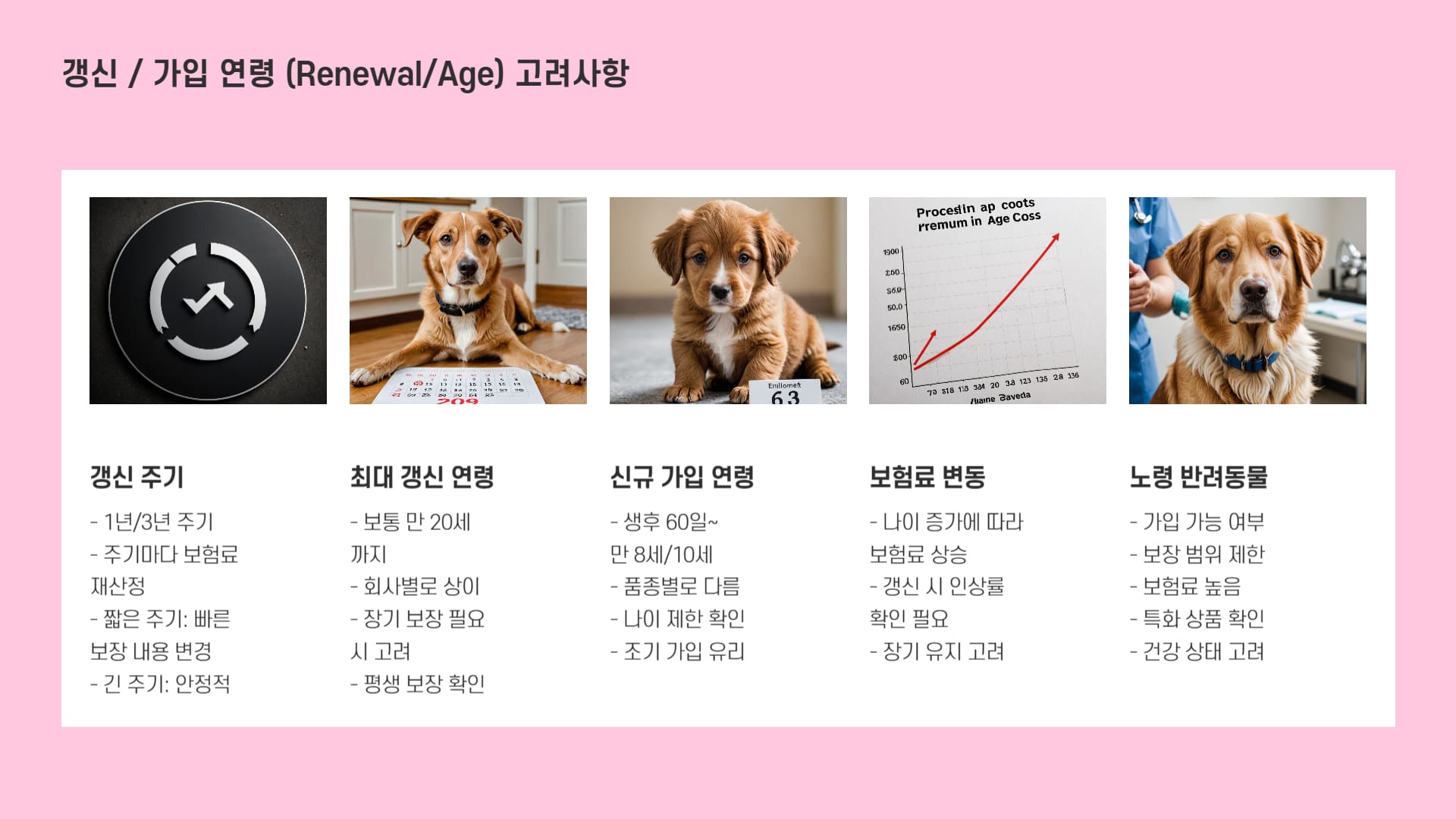 | 갱신 / 가입 연령 (Renewal/Age) | 갱신 주기(1년/3년 등), 최대 갱신 가능 연령(예: 만 20세까지), 신규 가입 가능 연령(예: 생후 60일 ~ 만 8세/10세). | 나이가 들수록 질병 발생률이 높아지므로, 최대 갱신 연령이 긴 상품이 유리. 노령견도 가입 가능한지, 갱신 시 보험료 인상률은 어느 정도인지 확인 필요. |