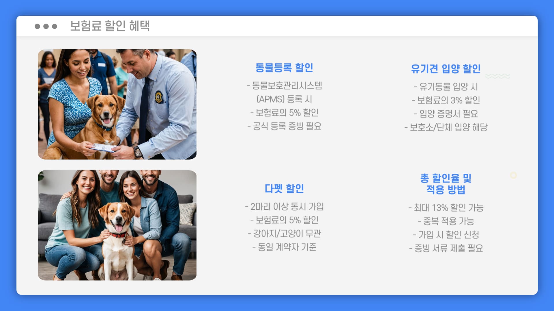 - 유기견 입양 할인 (3%): 유기동물을 입양하여 가족이 된 경우 3% 추가 할인이 가능합니다. (관련 증빙 필요 가능성)