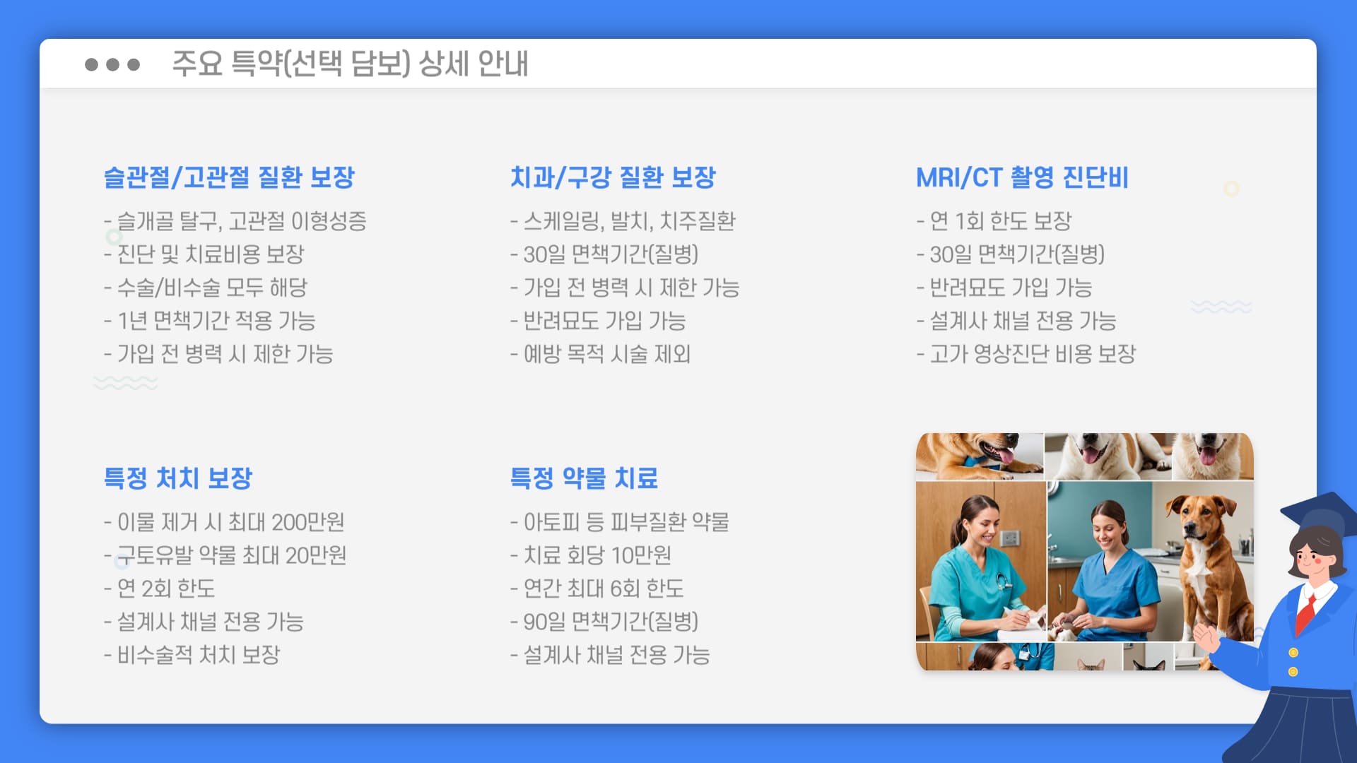 | 특수 검사/처치 (특약) | MRI/CT, 이물 제거, 특정 약물 치료 등 | 선택 가입, 횟수/금액 한도 등 확인 필요 |