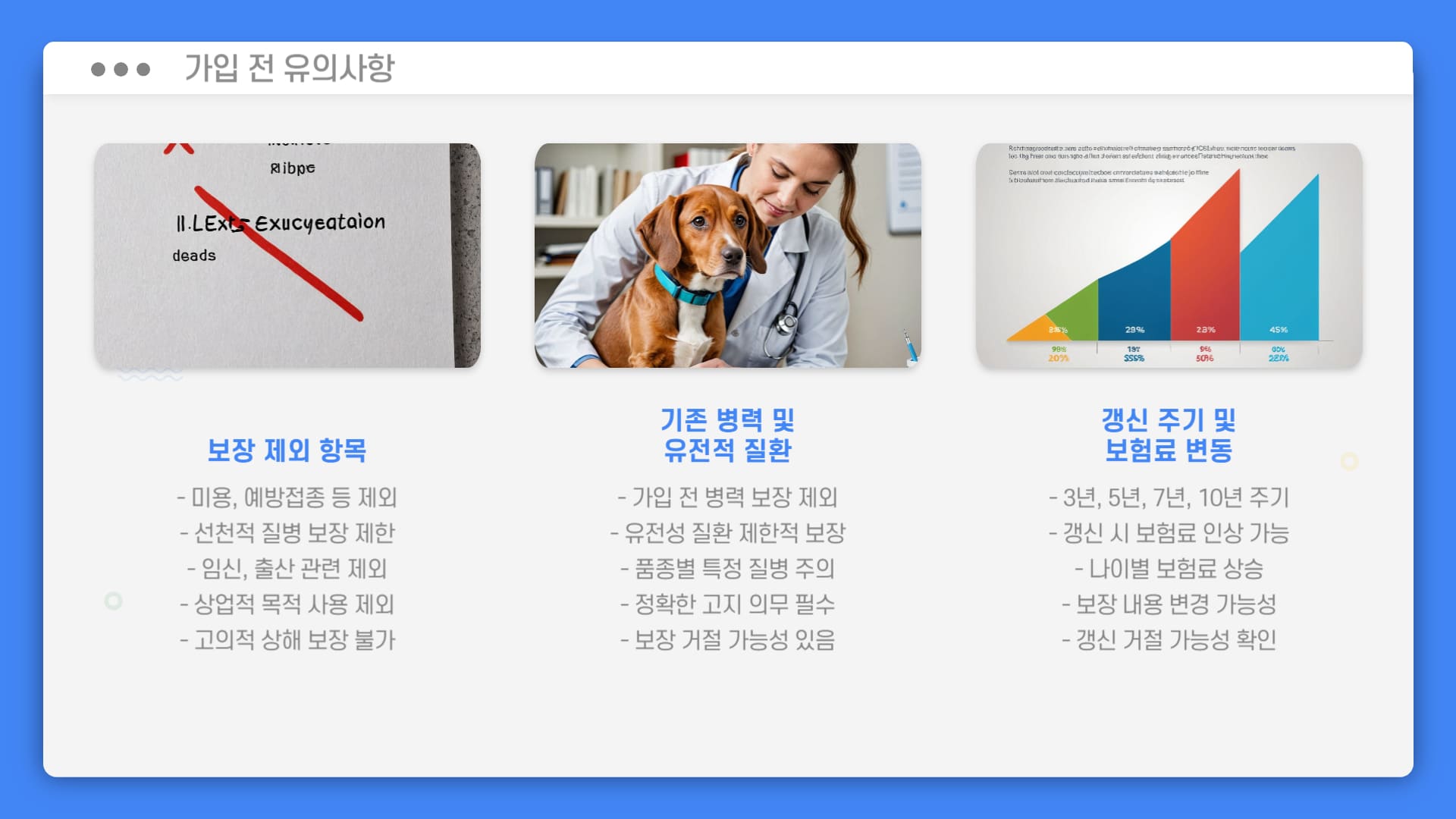 - 동물등록 할인 (5%): 동물보호관리시스템(APMS)에 정식으로 등록된 반려동물은 보험료의 5%를 할인받을 수 있습니다.